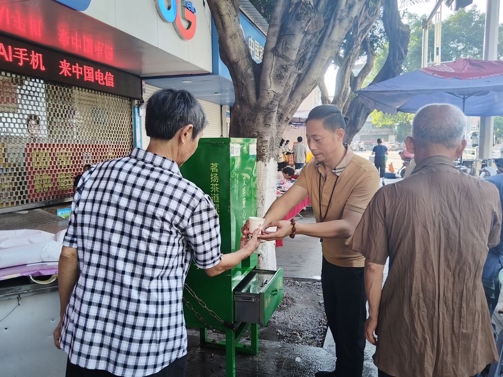 合川区融媒体中心全媒体报道(记者 周云)7月27日7时30分,合川区茶业行业协会会长、合川茗扬茶道创始人杨伟驾驶一辆绿色电动送茶车,来到久长路步行街鹿角栅公交车站,为他设立的“文明爱心茶”桶添茶。茶桶